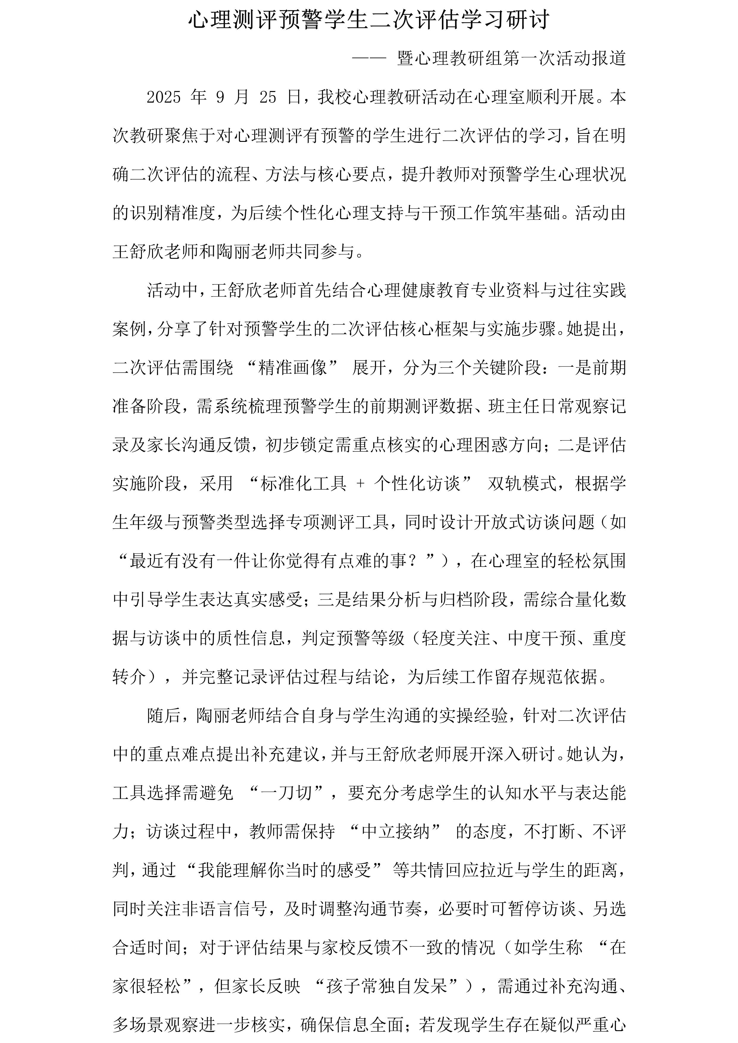 心理测评预警学生二次评估学习研讨
