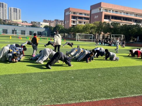 在小组接力与完整比赛环节,学生们以饱满的热情投入挑战,后续同学在等待时同步完成开合跳、深蹲等辅助练习,既提升了训练密度,又培养了规则意识与团队协作精神。最后的素质练习与放松活动,让课堂张弛有度,帮助学生科学恢复身体状态,既达成了体适能训练目标,又让学生在趣味情境中感受运动乐趣。